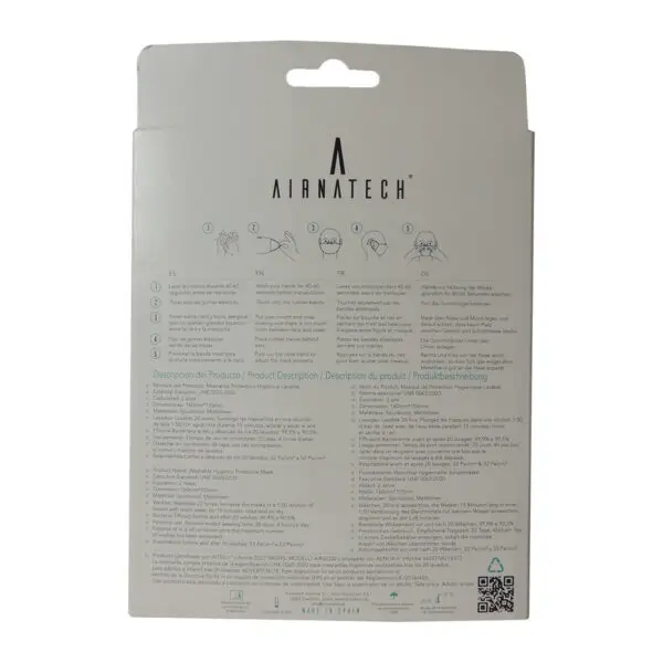La mascarilla higiénica Airnatech en color negro es la elección ideal para quienes buscan protección y estilo. Con capacidad para 20 lavados, asegura una protección continua sin sacrificar comodidad.